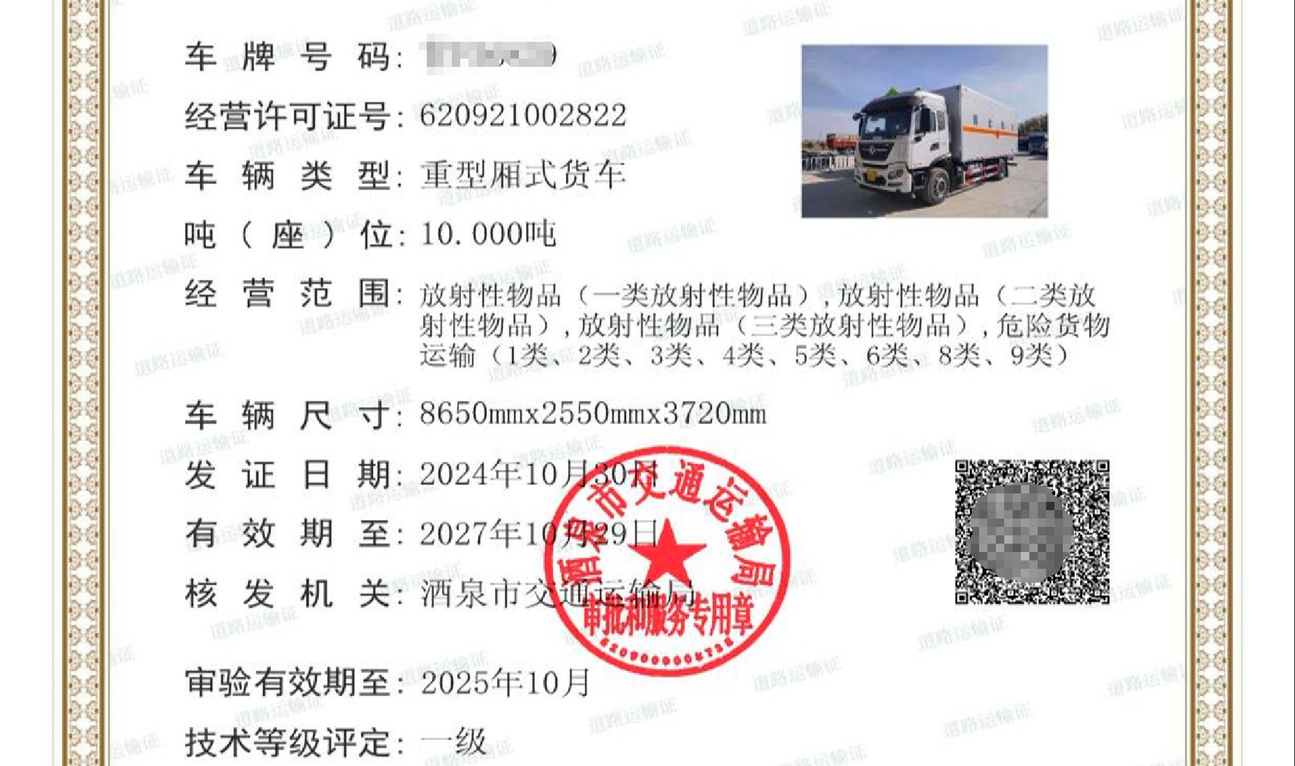 中國:《放射性物品運(yùn)輸安全管理?xiàng)l例》要求運(yùn)輸企業(yè)取得“一類放射性物品運(yùn)輸資質(zhì)”,車輛需通過國防科工局審查。