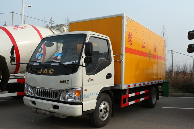 運輸品名:炸藥,雷管,類項號: 1.1D,1.1B。車廂頂部封閉,不可開啟,側(cè)防護(hù)為螺栓連接,后防護(hù)為焊接連接,后部防護(hù)裝置斷面尺寸(寬贅?:50mm?00mm,離地高度為410mm.該車裝配具有衛(wèi)星定位功能的汽車行駛記錄儀,該車裝配有限速裝置,ABS控制器型號及生產(chǎn)企業(yè):CM4XL-4S/4M,廣州科密汽車電子控制技術(shù)股份有限公司,安裝前盤式制動器.
